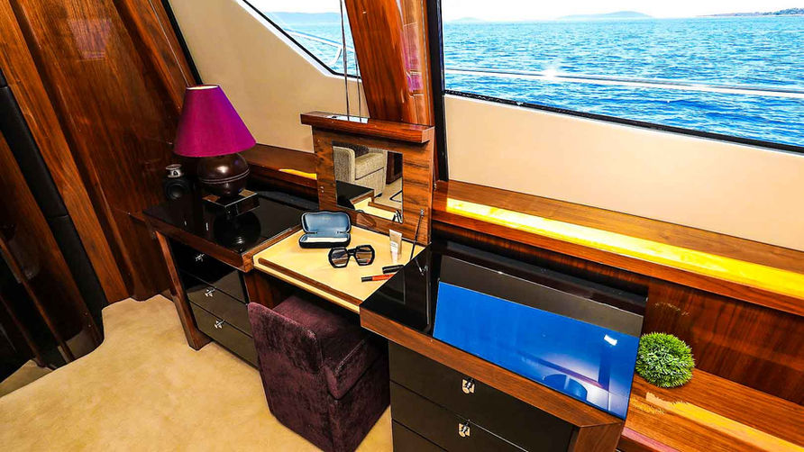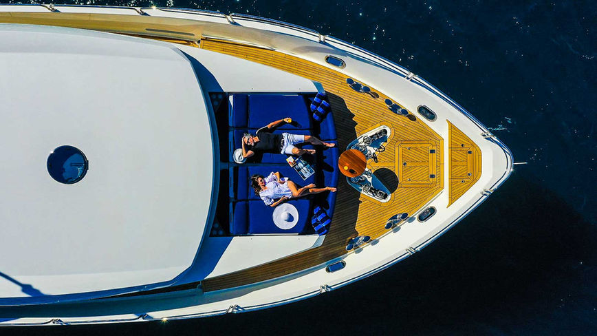 Designed and built by Sunseeker, CASSIOPEIA was delivered in 2009 and carried an intensive refit in 2020. True to Sunseeker’s style she boasts a sophisticated and sleek exterior in the classic navy and white color scheme. With 5 staterooms consisting of one Master in main deck, two VIP’s and two twins she accommodates up to 10 guests comfortably. Perfect for large groups or family charters. Timeless styling and sumptuous seating is featured throughout. The hub of the yacht on the sundeck has everything for charter guests including a bar, Jacuzzi with large sunbathing pads, and a dining area under shade .