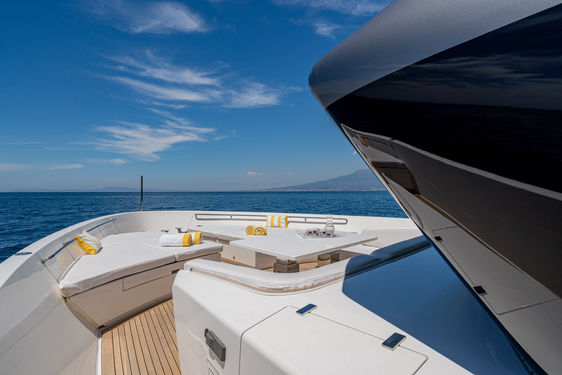 The foredeck features a sofa, a coffee table, and an extended sunbathing surface, providing a relaxing and functional living space.