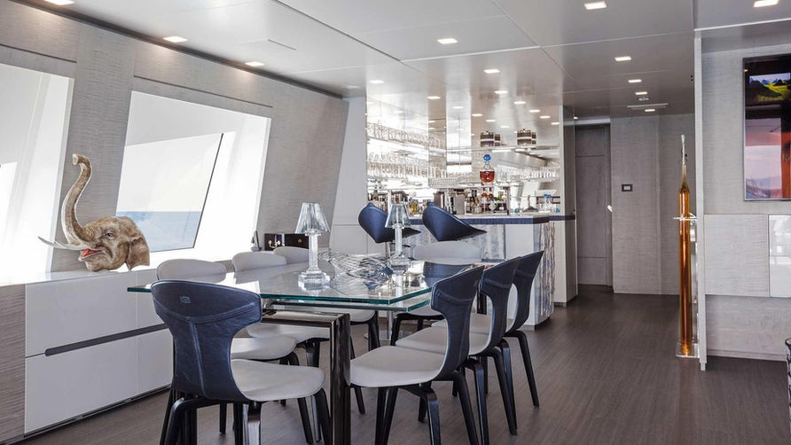 'H accommodates 10 guests in five chic staterooms, providing each charter guest with luxurious havens to rest their heads. At 900 square feet, the main deck master stateroom is expansive. Showcasing large windows, guests can relax in the king-size bed while taking in the spectacular views that surround. The master stateroom is complete with a meditation room with an oversized lounge bed and lavish his-and-hers en-suite bath. Located below deck, the superyacht’s guest staterooms are positioned at water level to provide tranquil views. The guest staterooms include two king-bed staterooms and two twin-bed staterooms — each is complete with its own private en-suite bath. Unique to ‘H is the connection of the king-bed staterooms to the twin staterooms, offering two capacious, lavish suites.
