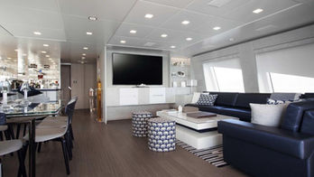 Showcasing a rejuvenating Zen-like interior, ‘H’s modern-style lounge seating provides ultimate comfort. After a day on the water, enjoy a movie in the main salon’s oversized cinema chairs or relish formal dining in the skylounge.