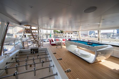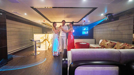 The upper deck is built for fun and entertainment. In the sky lounge is an onyx bar with 2 proper beer taps and a karaoke machine. This is complemented by a disco setup, featuring laser lights both inside and out and an outside smoke machine. Guests of 'all ages' will enjoy the self-levelling pool/billiards table and the football table on the aft deck. For those wanting to unwind, why not enjoy a massage in the dedicated massage room.