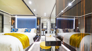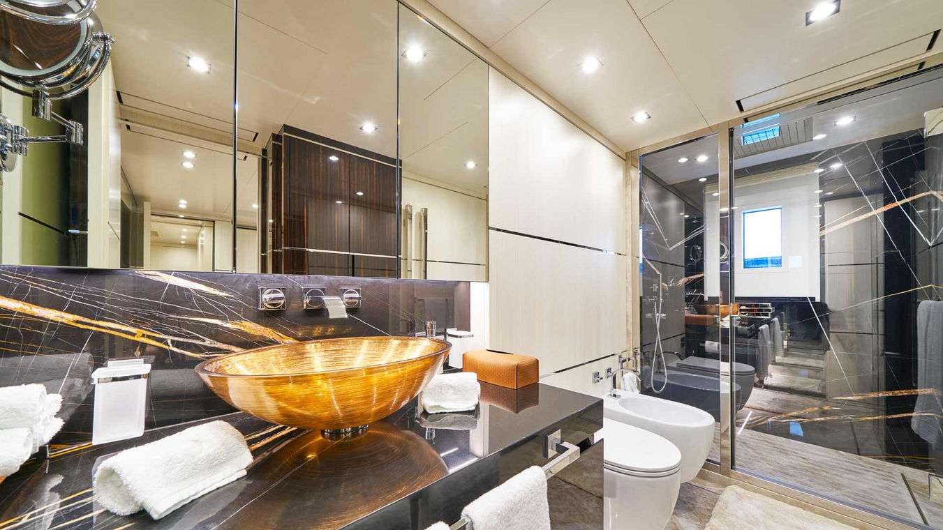 On the lower deck are located the guests staterooms : 2 VIP queen double staterooms, a twin stateroom (with additional pullman berth) and a convertible stateroom (twin or double format for extra flexibility). All have heated marble en suites with showers. Lighting, temperature, TV, music and curtains in all guest areas are controlled with the onboard iPads.