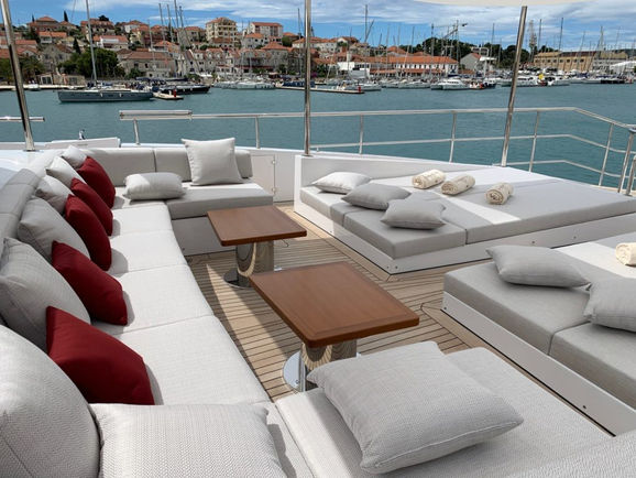 Among the special features of HAPPY ME is the foredeck sunbathing area, with a Jacuzzi, 2 telescopic tables , sunpads with moveable headrests and a retractable bimini for shade.