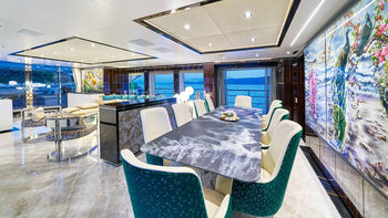 On the main deck is the chic main salon, featuring silk artworks created from millions of individual
