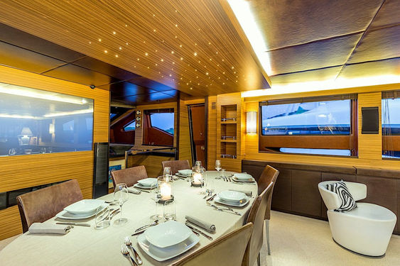 Delivered in 2009, she went through an intensive refit in 2014. With her 31 meter-length, she offers wide outdoor spaces like a couple of sun loungers with a sofa bow and a large aft deck with dining table. The large swimming platform is connected with the storage locker where the dinghy, water games and equipment of diving are stored.