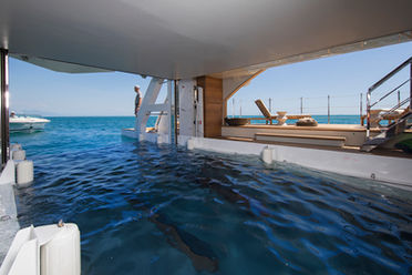 LADY LENA features a glass-bottomed swimming pool that allows light to filter down to a luxurious beach club area with fold-down side balconies.
