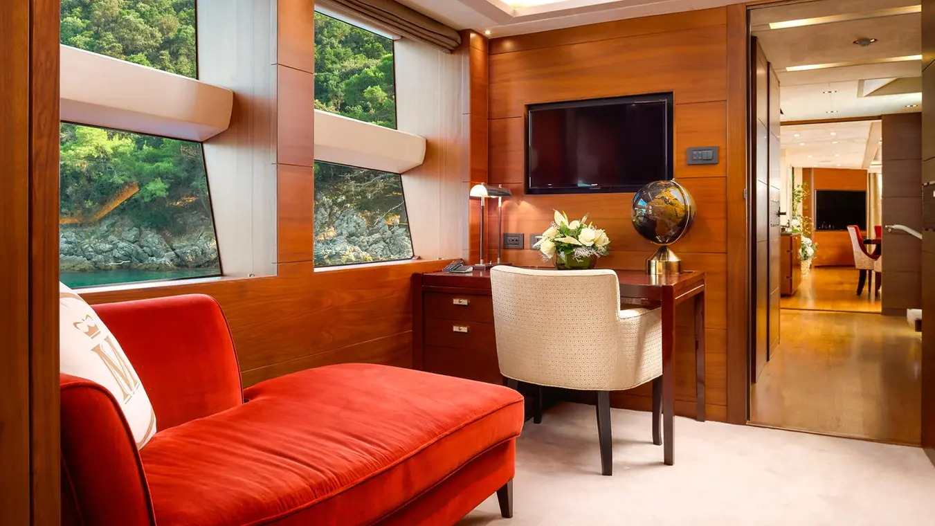 MIRAGE IV yacht for charter features a welcoming interior, designed for both relaxation and style. Mirage IV accommodates up to 12 guests in six elegant cabins.
