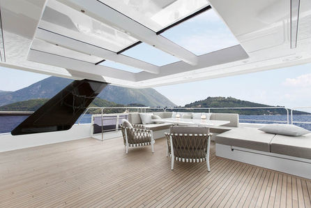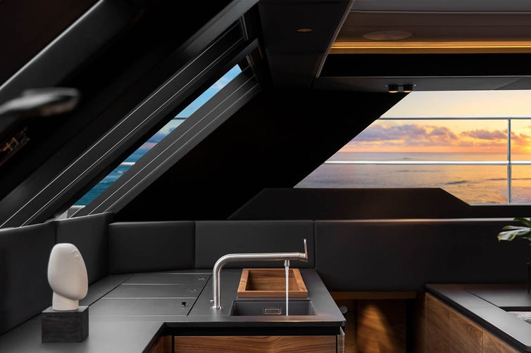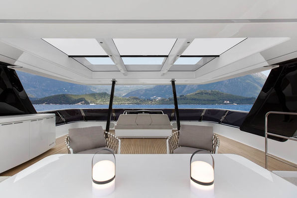 The main salon with its generous lounging and dining areas seamlessly blends with the aft cockpit and the expansive bow terrace. Inside plenty of sunlight floods the mdoern interior either through the panoramic glazing or the skylights.