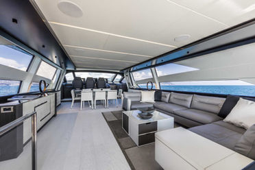 The PERSHING 9X is a super-sport 28m yacht. A floating “puro-sangue” able to cruise as a “lighting bolt”. The perfect blend of luxury and technology. Powered by 2 x MTUs for a total power of 5,276Hp, coupled to surface-drive propulsion system, the numbers of the PERSHING 9X are astonishing : 16 seconds to reach 20kn from standstill and top speed of 42kn ! A Jet Fighter in the water. The fly is built in carbon fiber and stability underway is granted by 2 gyro-stabilizers. She can cruise in “economical” mode at 25kn. Beside the above impressive numbers, the PERSHING 9X features elegance inside and outside, painted hull and superstructure, plenty of space for guests to enjoy an upscaled yachting experience. The Sport-Fly, with “race” style helm seats, measures 30sqm and is comfortable for sunbathing. Aft cockpit includes table, seating area and generous sun lounge just above the tender hangar. Swimming platform is hydraulic, allowing easy launching of the tender and toys, plus turns into a comfortable beach club. Main interior salon is in direct connection with the wheel house, allowing passionate guests to experience together with the captain the “command” of this Jet Fighter. Plus, the salon’s aft door features a hideaway mechanism creating a full open air in between interior salon and aft cockpit. All furnitures are designed specifically for this model by well known Poltrona Frau. Luxurious and modern style sparkle throughout the cabins. PERSHING 9X can accommodate comfortably 8 guest in 4 cabins located in the lower deck, all en-suite. For day cruising she can host 12 guests. A wide selection of water toys and a very meticulous crew of 3 will enhance furthermore your yachting holiday on board the PERSHING 9X.