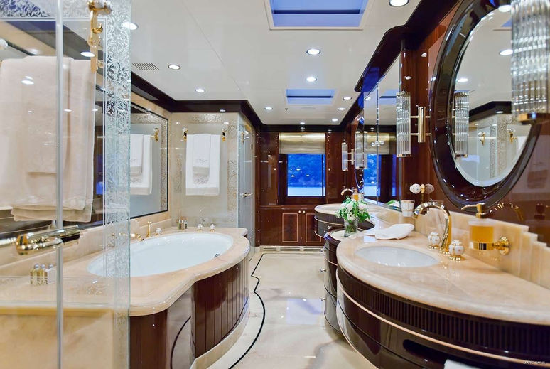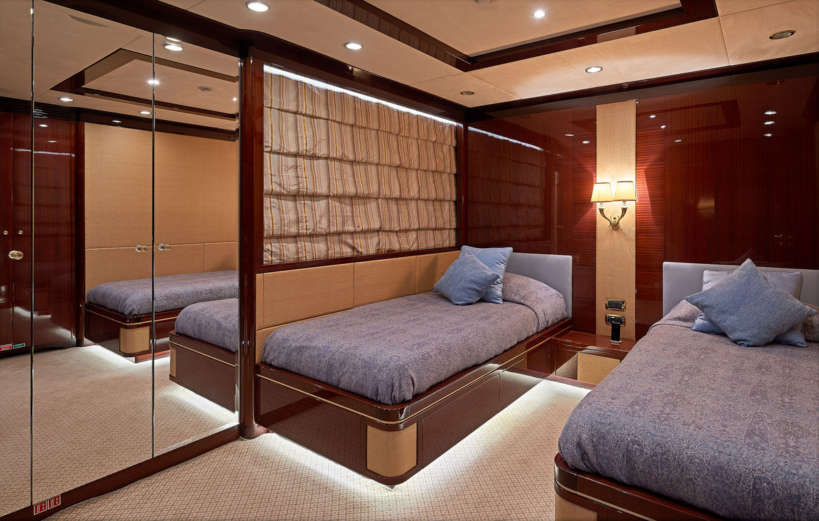 Rêve d’Or accommodates up to 12 guests in six cabins : master located in the upper deck, one VIP cabin, two double cabins and two twin cabins. All rooms have AV systems and en suite facilities. A crew of nine are on hand to assist with her vast range of water toys, which include a fast rescue tender, jetski, and diving equipment.