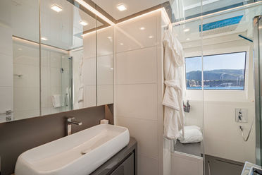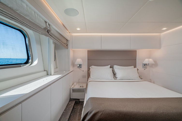 She can accomodate up to 12 guests, offering 2 master cabins located on the main deck, each with identical layouts. The additional 4 double cabins are located on the lower deck, with two cabins convertible into twin beds, offering versatile accommodation options to suit any charter guest’s preferences.