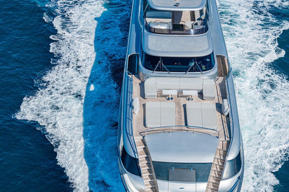 SANDS features spacious and elegant interiors, with multiple lounging areas, perfect for relaxation and socializing. The yacht is designed for comfortable indoor & outdoor living, with beautifully appointed sitting and dining areas, as well as an expansive flybridge. The outdoor bar on the top deck is ideal for unwinding with a refreshing drink while enjoying breathtaking panoramic Mediterranean views. Same for the foredeck raised lounge.