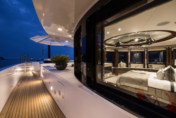 SOUNDWAVE can accommodate up to 12 guest in 12 sumptuous staterooms. The Master cabin is located in the upper deck and features a private deck, 180 degree view, jet pool and sunbathing area. Plus, an adjacent nursery room. VIP features a full beam layout, as big as the master, positioned in main deck with own private lounge and extremely spacious en-suite. The other four guest cabins are located in the lower deck and are all doubles, Two can convert into twins on guests choice.