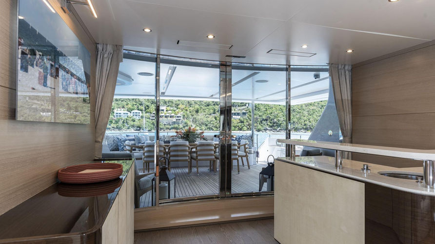 The superyacht’s interior has a welcoming ambiance. Designed by Zuretti Interior Design, WABASH showcases a contemporary styled interior. The space is tastefully decorated with a mix of light and dark wood, as well as cream furnishings and leather paneling. Floor-to-ceiling windows are found throughout, enriching the spaces with natural light. The charter yacht’s main salon is comfortable and appealing with ample seating. WABASH’s skylounge is a second living area and is perfect for family game nights or just hanging out.