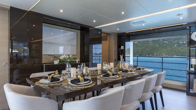 With the beautiful azure ocean as the backdrop, charter guests can dine alfresco and enjoy the sights and delightful breezes while sampling delectable meals. WABASH also offers the option for formal dining in the main salon.