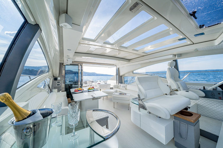 Forward ZEUS features a large sundeck to enjoy the best of the experience offered by Azimut 68S. In 2020 she underwent a major refit with a total replacement of the upholstery as well as several slight upgrades. With its new generation engines she has a very low fuel consumption at a speed of 28 knots, offering an astounding cruise journey.